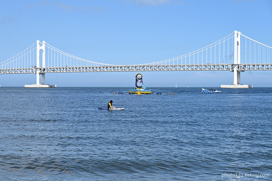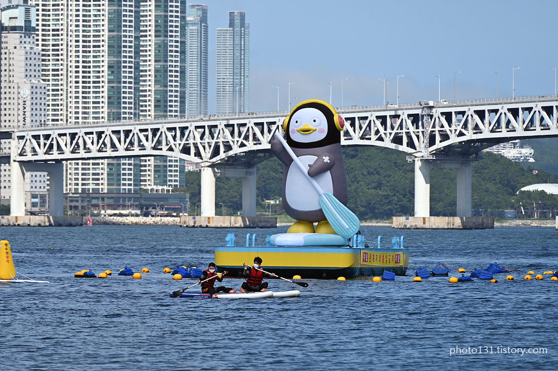 멀리 광안대교 근처에서 SUP를 타는 초대형 펭수