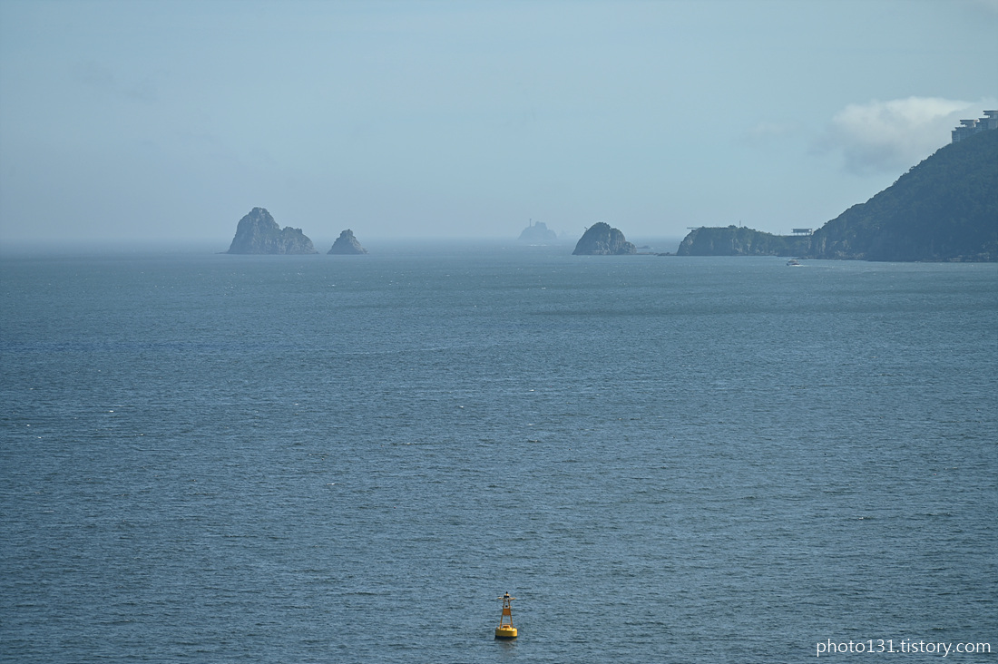 동백섬 왼쪽 멀리 주상복합 69층 W아파트, 오른쪽 빌딩숲은 마린시티